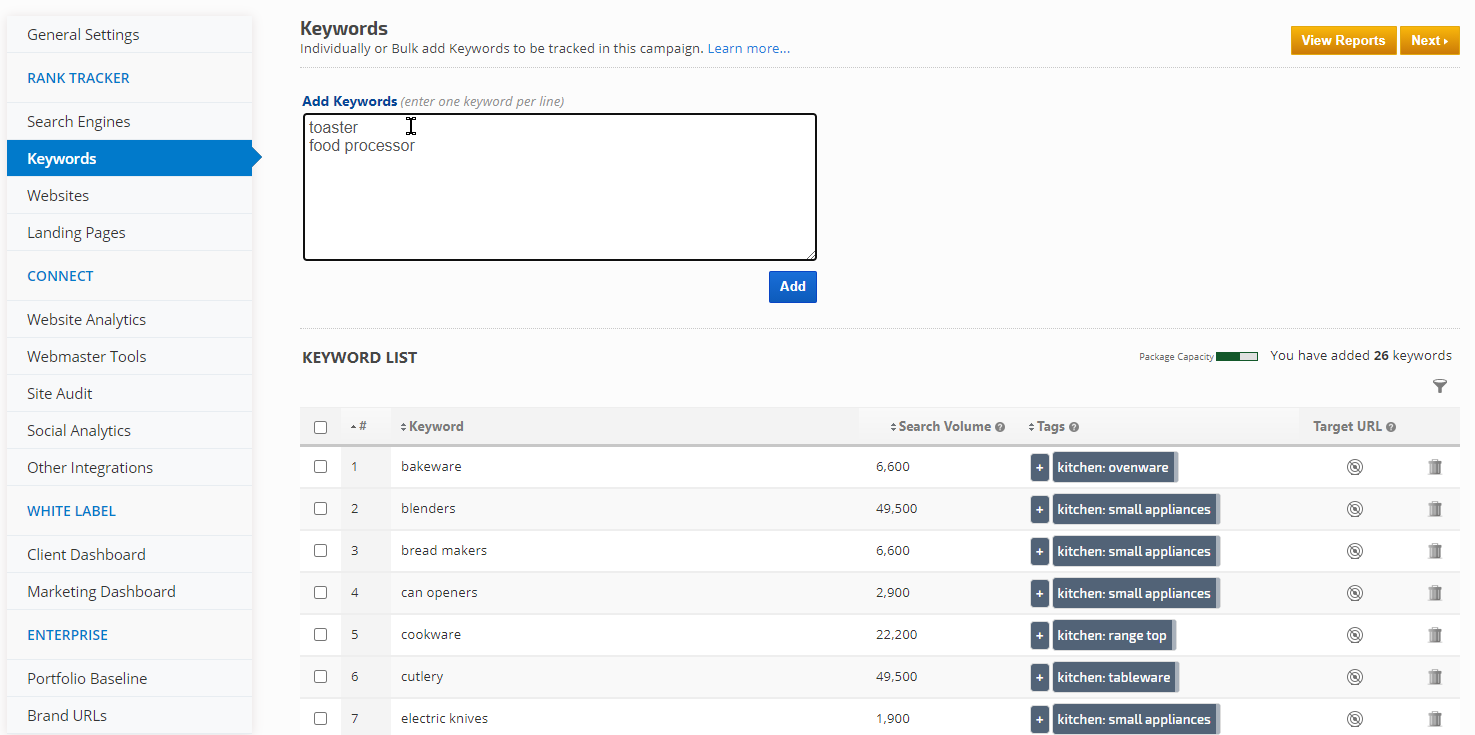Please add no more than 1000 keywords per campaign in order to ensure efficient report generation and convenient viewing (this is especially important when tracking competitor URLs that you'll want to view in comparison to the primary domain). Adding more than 1000 keywords to a campaign will cause some functionality to be disabled. Please note that the Classic Campaigns Home screen that calculates rank change on the fly has a limit of 500 keywords per campaign.