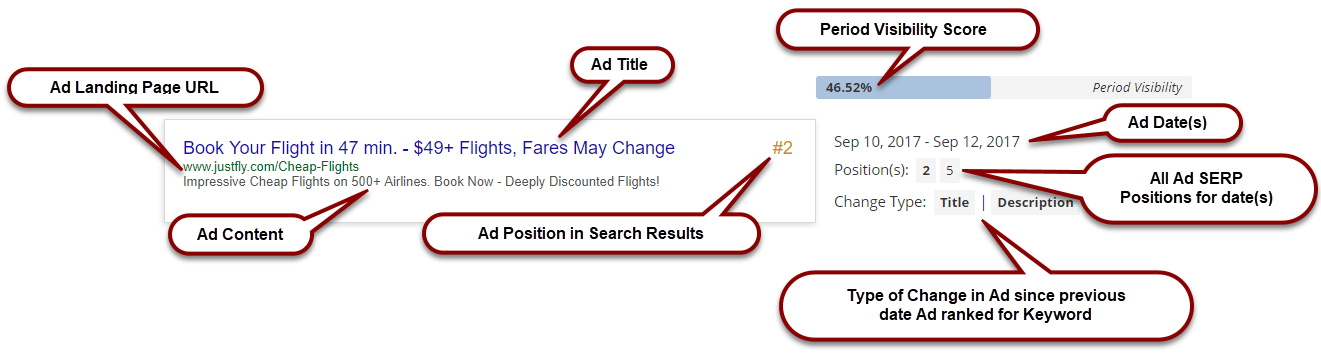 The Competitor Ad Changes report is interactive and provides options for the discovery of the title, link, description, and multiple ad placement positions for the site advertised for the tracked keyword. In this example, the keyword has ranked in positions 2 and 5 for different target landing pages and with different ad copy.