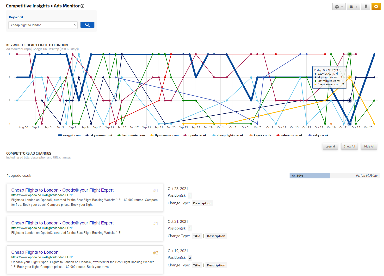 The Ad Monitor Graph provides a colorful analysis of competitor ads for the previous 60 days. Below that you'll find a Competitors' Ad Change report that details the Ad title, content, landing page, and paid ad placement positions for the selected keyword. A change highlight feature makes it easy to view the type of change that occurred in paid ads displayed in the search results between one day and the next (e.g., ad title or content change, landing page URL change).