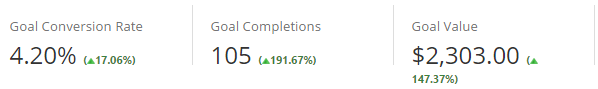 By selecting to Display Goals in Report Options, you will be shown the Goal Conversion Rate, the Goal Completions and the Goal Value for the selected goal or the total for all your goals if All Goals was chosen (provided you have set Goal Values in Google Analytics).