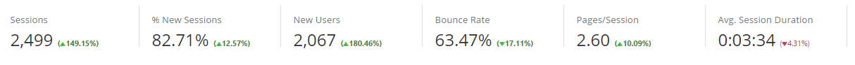 Analyze traffic metrics including the number of sessions, the percentage of those sessions that are new visits to the site, the number of new users visiting the site, the bounce rate, the average number of pages visited per session and the average session duration for visits the site. You can also view the change from a previous time period by selecting 'Compare to Past' with a date range in Report Options.
