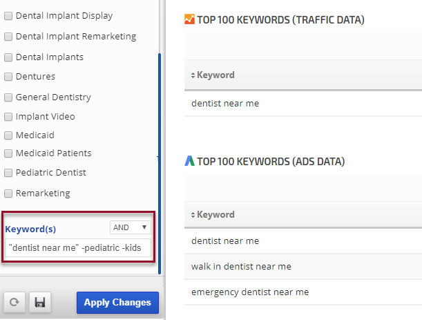 In the example below, the keyword filter is set as "dentist near me" -pediatric -kids with the AND operator, and as such the report lists only the keywords that contain "dentist near me" AND without the words pediatric or kids.