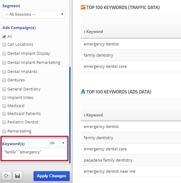 In the example below, the keyword filter is for "family" OR "emergency" and as such, the results include any keywords that contain either of those words.