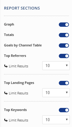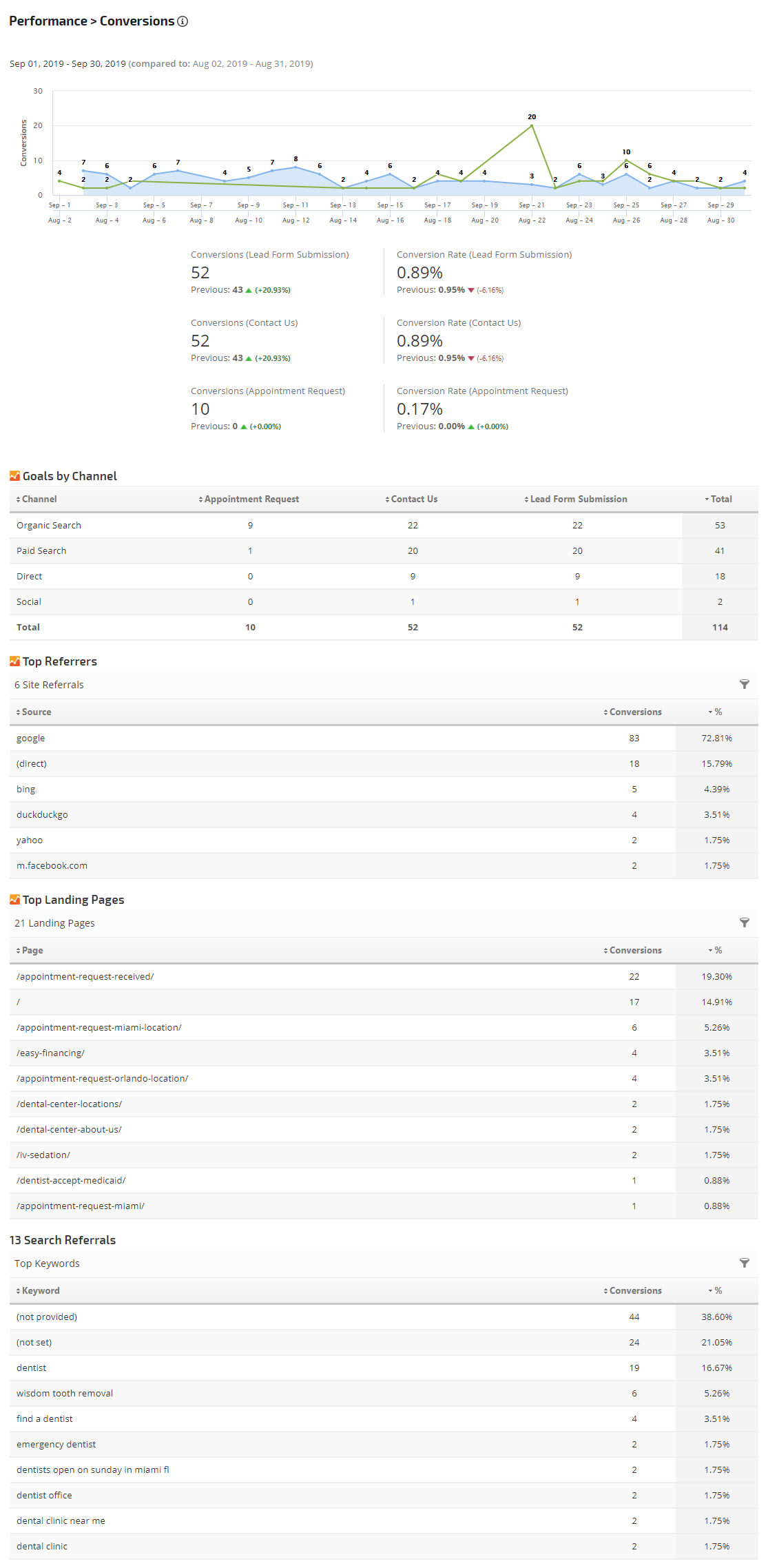 The Analytics Conversions report provides an enhanced analysis of your Google Analytics Goals conversions and e-commerce transactions including number and rate of conversions, top Referral Sources, Top Landing Pages, and Top Keywords. Hover over any point or number in the interactive graph to view the number of conversions or transactions on any day.
