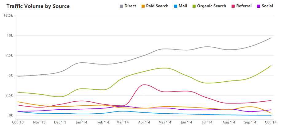 This chart shows the traffic from various sources, by month.
