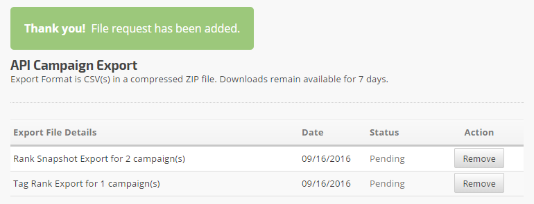 Export format is your choice of one CSV file for each campaign or any number of campaigns in one CSV file delivered via compressed ZIP file. Files are ready for download in 15 minutes to 24 hours depending upon the number of files and the queue at the time of your request. Files remain available for download for 7 days from the time of the request.