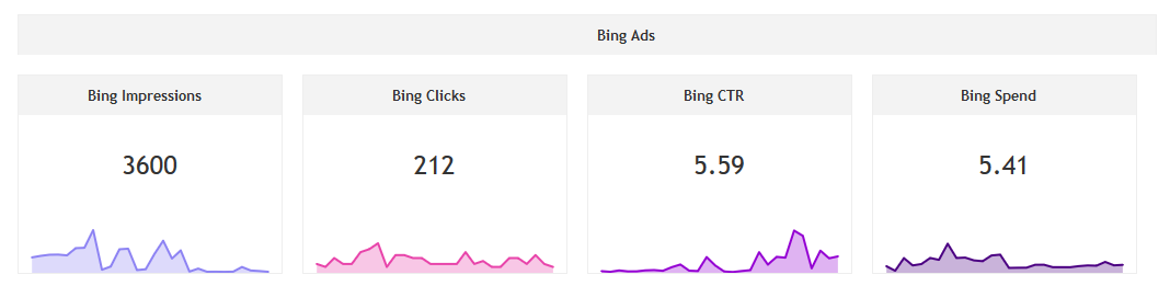Metric Widgets comparing PPC metrics from Bing Ads and Google AdWords campaigns, followed by the Bing Ad Groups Performance graph trending impressions, and a table displaying all available metrics (you may choose to highlight specific metrics and hide others).