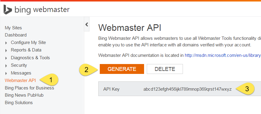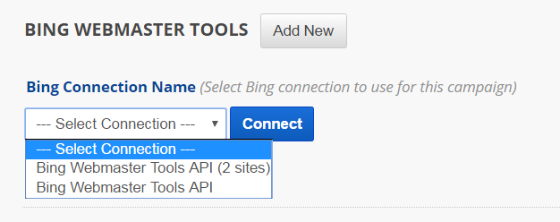 - If the screen displays with no options for selecting a Bing Webmaster account, then you need to follow the Authorize Bing Webmaster Tools instructions above for adding a connection to your account.