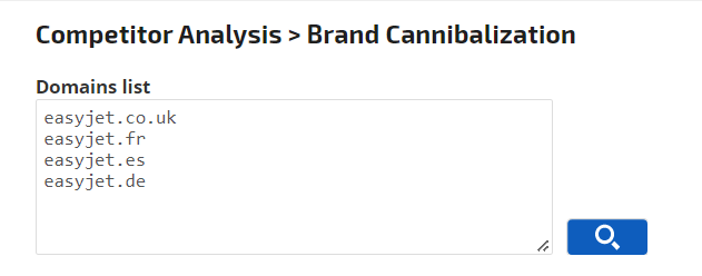 Add a domain per line, not including the primary tracked domain. In the example below the primary domain is easyjet.com, so the other same brand domain list would include domains for example, easyjet.co.uk, easyjet.fr, and so on: