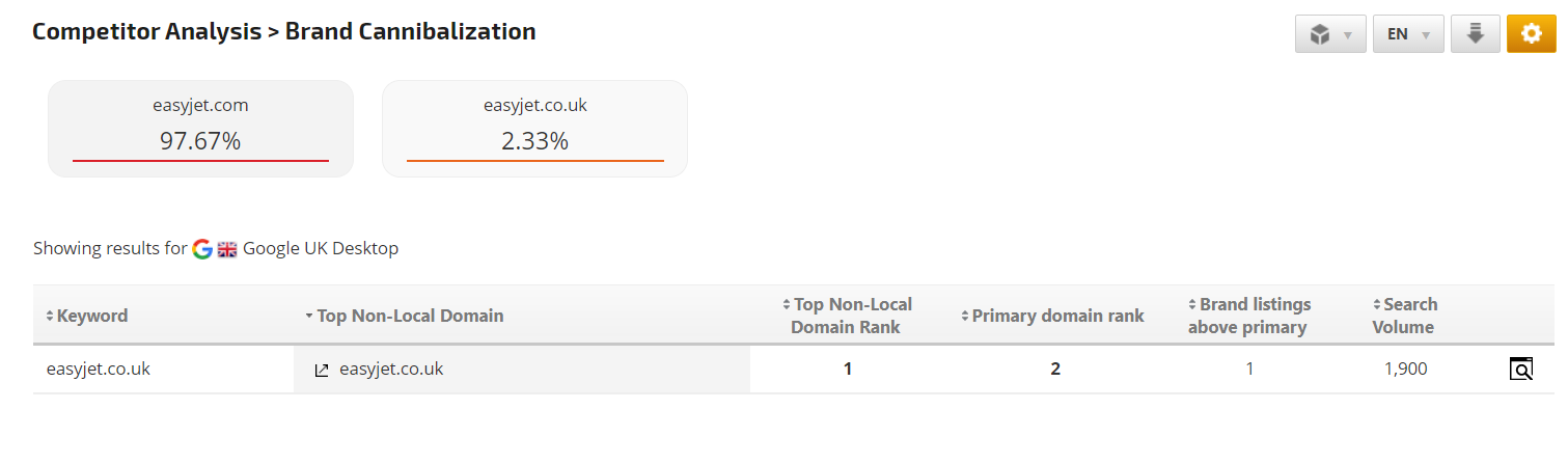 Brand Cannibalization is a tool that helps to research when the same branded sites rank above the primary tracked domain (local market domain). When the primary domain is preceded by the same brand Non-Local domains such as a site with a different country location or language, creates a negative implication such as traffic cannibalization and loss of clicks for the primary domain.