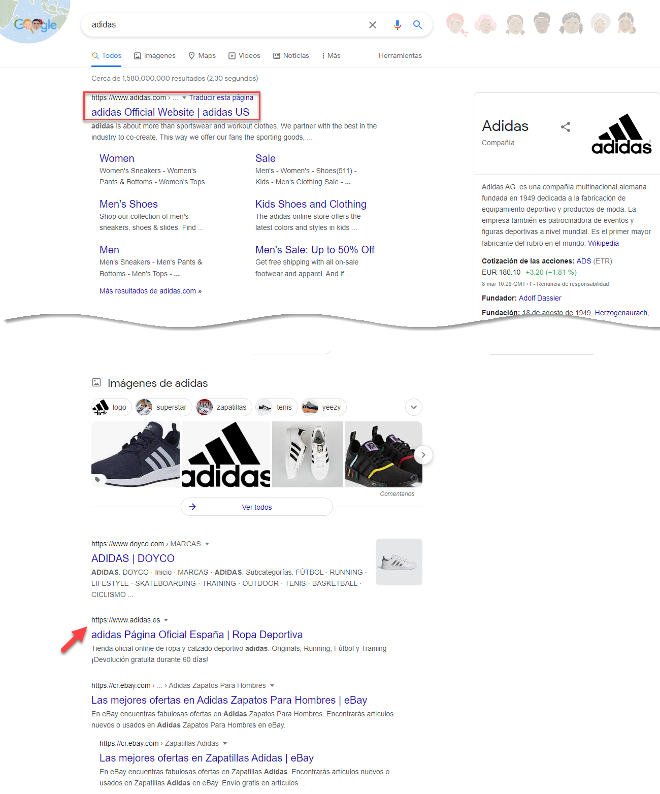 The following is an example of the search result for "Adidas" from Costa Rico where Google returns the first result as adidas.com (see in the red square). While the adidas.es only comes later on in the page (see the red arrow pointing to the result)
