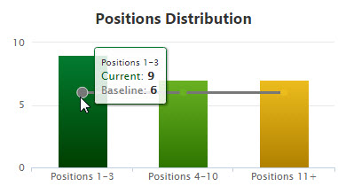 The Positions Distribution Chart provides the total (for all keywords in the campaign) number of times any of your brand pages rank in the top 20 search engine results on the day the report is run. The dark gray line represents the baseline number of times brand pages ranked in the top 20 on the day we began tracking the Brand URLs. You can hover over the chart to view the actual numbers.