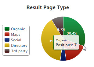 The Results Page Type pie chart provides a graphic representation of the number of the brand top 20 search results by type - Organic, Maps, Social, Apps, Directory and 3rd party sites. You can hover over any section in the pie chart to view the number of positions for that page type.