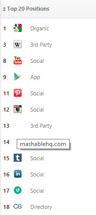 In the Top 20 Positions column, if the brand ranks for the associated keyword in the top 20 SERP results, you'll find the Rank and type of brand page along with a logo icon, if available. If an icon does not display for the page type, you can hover over the area between rank and third party to reveal the URL.