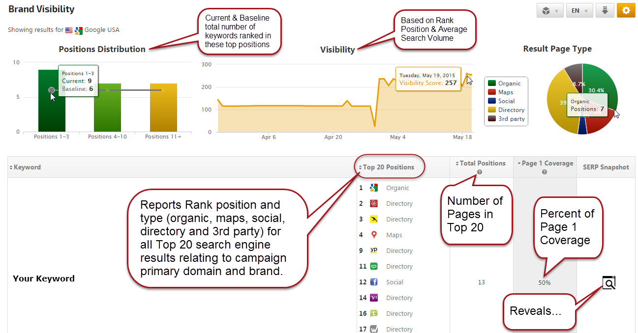 Brand Visibility is a universal search results report providing daily rank position for brand-related pages (e.g., website, Maps, Google Business Page, Facebook business profile, LinkedIn company page, directory listings, Wikipedia bio, etc.) ranking in the top 20 Google Desktop and Google Mobile search engine results, along with position distribution, visibility trending, Page 1 coverage, and category of results. A SERP Snapshot displays the actual Top 20 rank results, Top AdWords Ads and Google Related search phrases.
