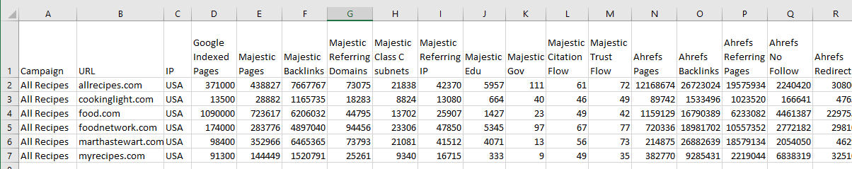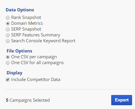 Use our Campaign Export tool to easily export a Domain Metrics report in CSV format containing primary domain and an option for competitor domains.