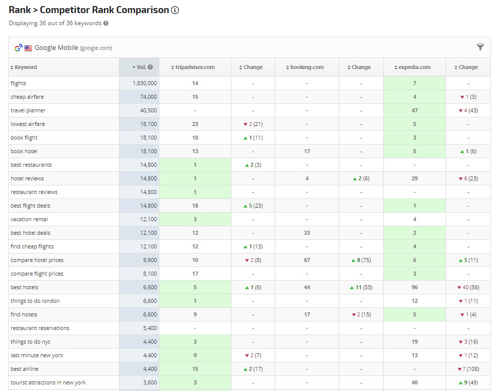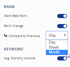 Rank data can be filtered by keywords, keyword tags, and search volume. Custom sort options allow for sort by any of the report columns in ascending or descending order.