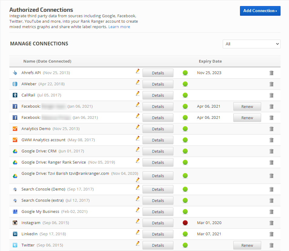 Because it's important for your white label social analytics reports to contain data, our system proactively validates authorized connections daily. When an expired token is discovered, the system sends a message to the account owner with a link to our Authorized Connections screen and instructions to click the Renew button to reauthorize the connection(s).