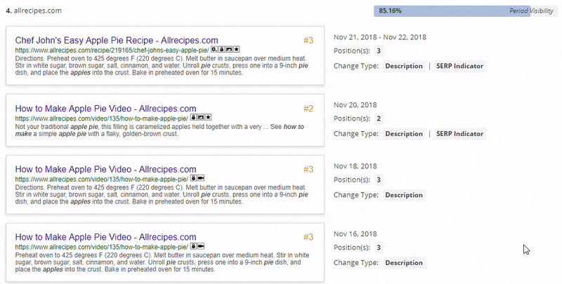Click on a Change Type (e.g. Description, SERP Indicator, etc.) to highlight the change between the rank date and previous date.