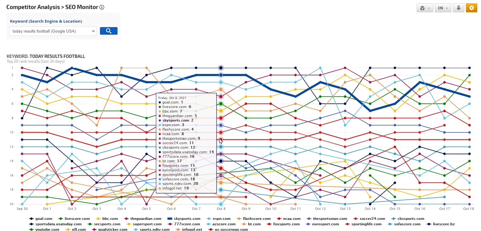 Based on the selected report options, this graph displays the rank trend for 1 keyword on 1 search engine for the last 30 days, for the top 5, top 10, top 15, or top 20 competitors.