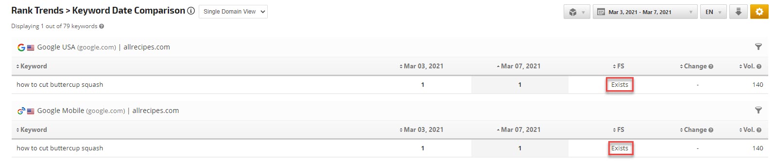 - Change Type: the type of change that occurred in the SERP between the rank date and the previous rank date. Clicking on a change type highlights the change.
