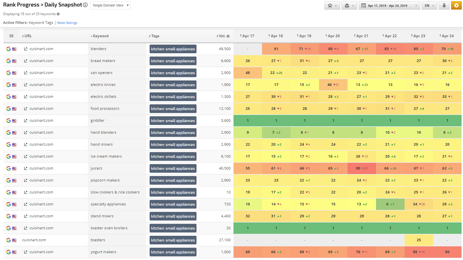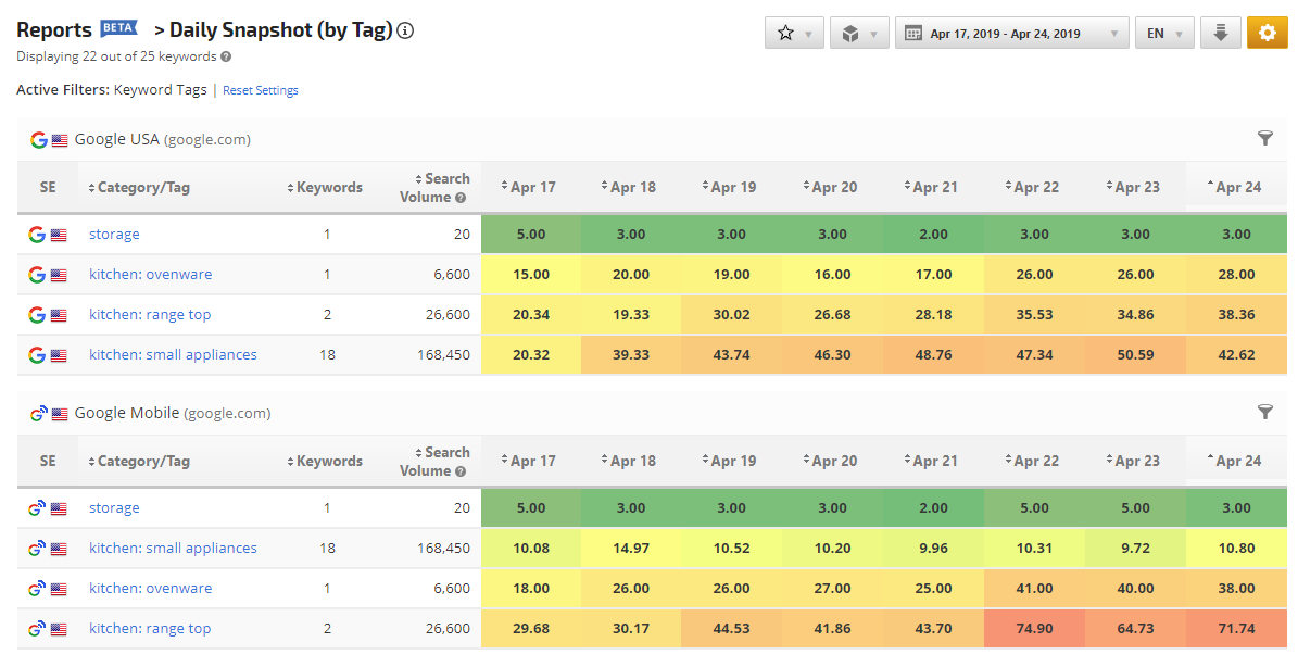 The Daily Snapshot by Tags report is a feature available in Enterprise packages. It provides a summary of daily rank by keyword tag groupings. This report utilizes the Average Weighted Rank based on search volume and the rank of the individual keywords within the tag group. When viewing the report, you can drill down to the keyword list with individual rank trends by clicking the tag name.