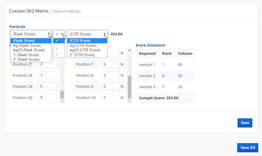 - In the CTR score section make any adjustments you want for the top 10 positions