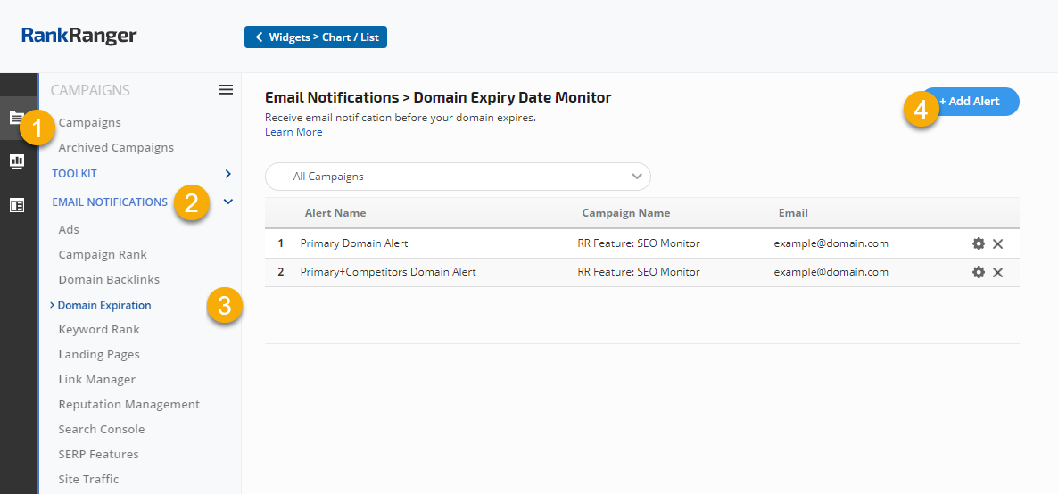 Disclaimer: The Domain Expiration Date Monitor is a complementary tool for which a 3rd party tool is used to collect the expiration date for a domain(s) and Rank Ranger does not take any responsibility for a discrepancy. It is solely the client's responsibility to check the correctness of the information with their domain provider and for the domain renewal. Rank Ranger highly recommends monitoring domain renewal with their domain provider regardless of the Domain Expiration Date Monitor tool.