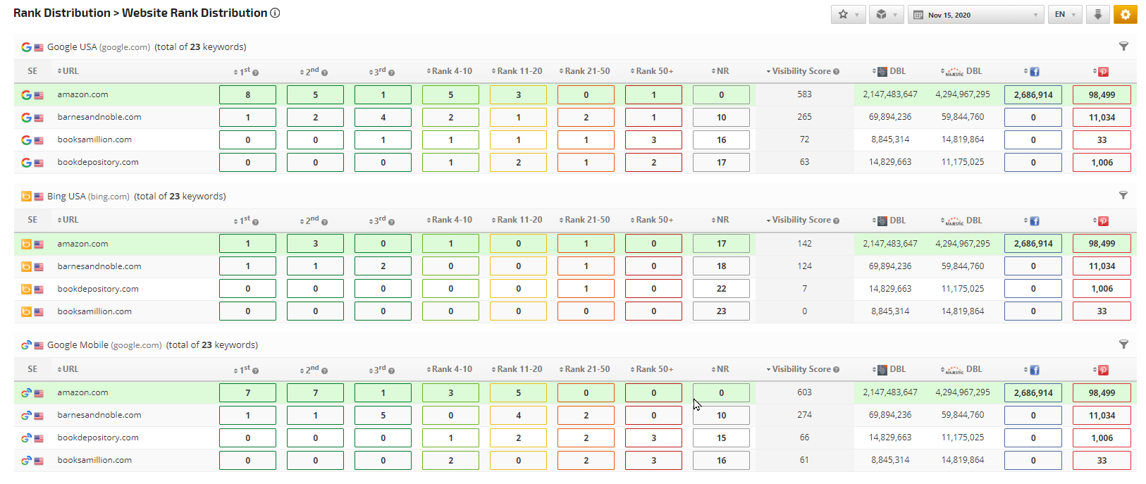 The Website Rank Distribution report displays the number of keywords ranking in 1st, 2nd and 3rd and up to 50+ position in the SERPs. Additional domain metrics include a score representing the overall strength of the domain, visibility score, Majestic and Ahrefs backlink data, and social signals for the primary domain and tracked competitor sites.