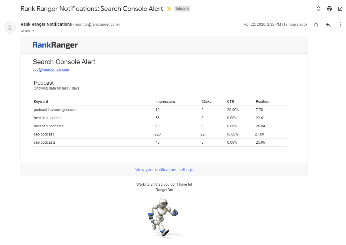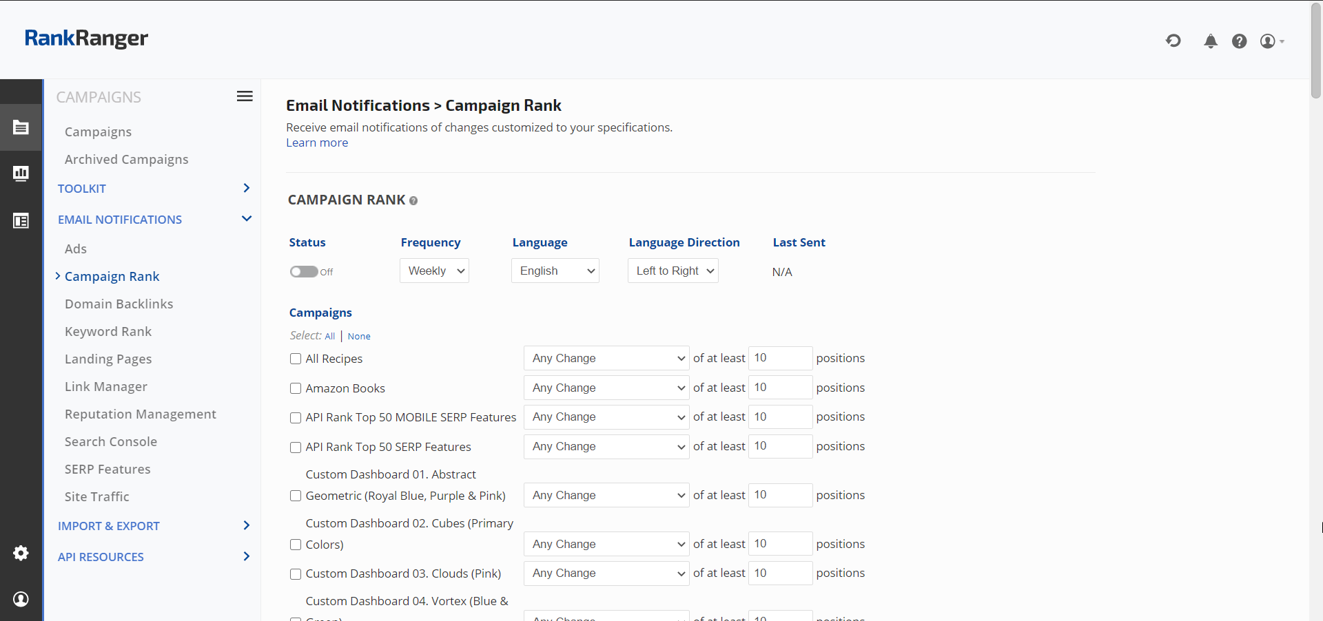Settings are located in the Campaigns > Email Notifications section of Rank Ranger.