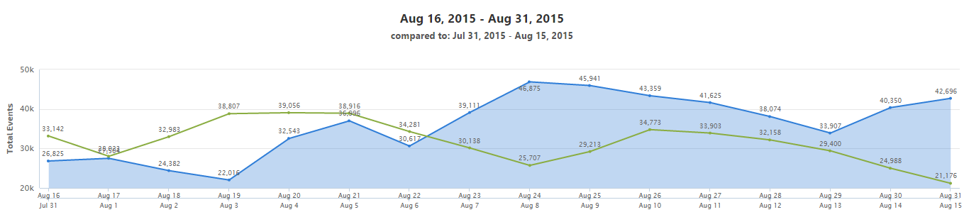 Use the "Compare to Past" option (located under Date in Report Options) to analyze traffic between two time periods, mouse-over any point or number for detailed description.