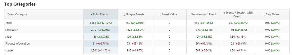 This section demonstrates the total number of events that occurred during the report period and provides metrics such as the number of unique events, value (if a value exists in Analytics for an event), and sessions involving events.