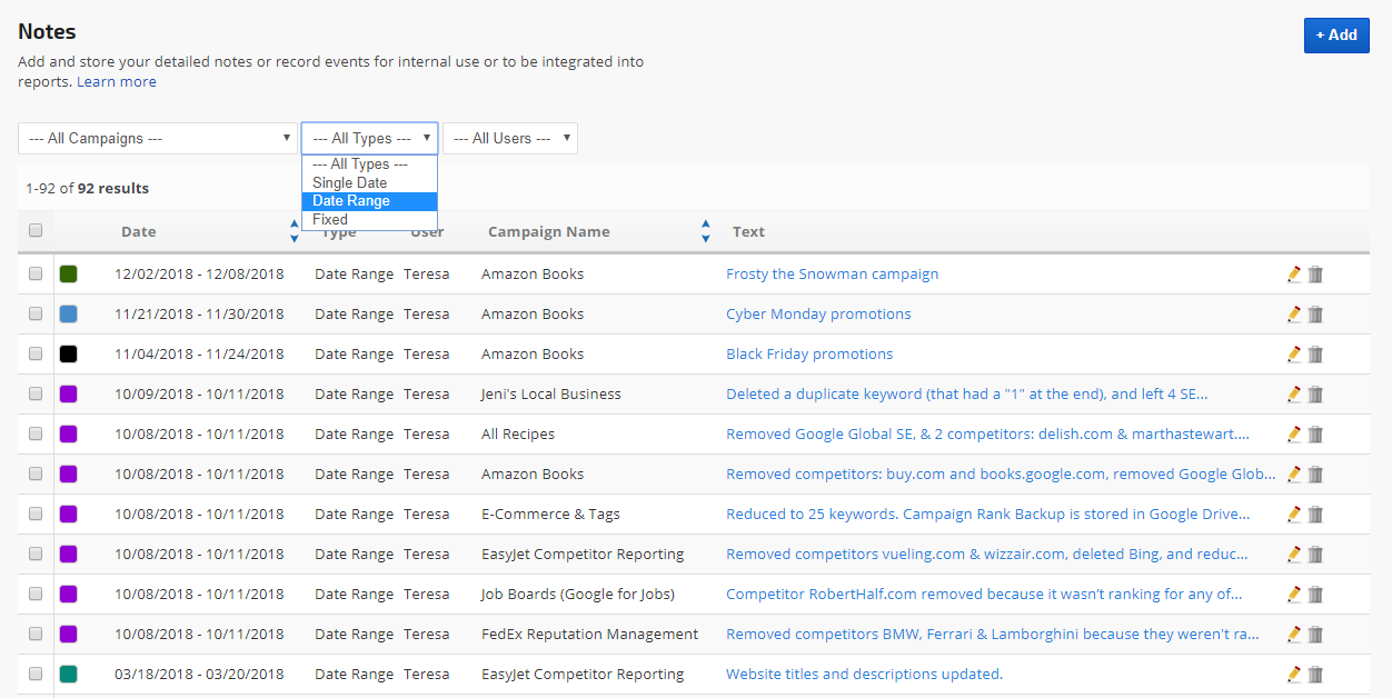There are 3 types of Notes that can be displayed in PDF Reports: Single Date and Date Range display text in a PDF based on the report date setting. Fixed notes can be used to display a message for a single campaign, specific multiple campaigns or account-wide continuously and the content can be changed as needed (in the Campaigns > Toolkit > Notes screen).