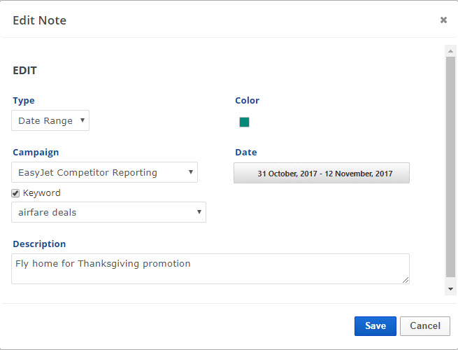 Clicking the + Add Note button launches a Notes detail screen with the Description automatically containing the basic information for that link. You may select for the note to display for a single date or date range, choose a color, select a campaign and even a specific keyword to apply the note to.
