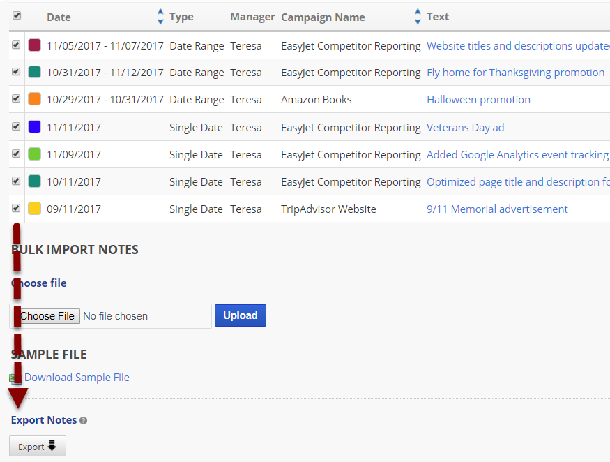 You can make a backup copy of your Notes using the Export option below the table. This exports all notes that apply to the Campaign and Type filter selected at the top of the screen. Click the Export button and save the CSV file to your computer.