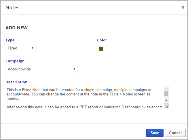 There are 3 types of Notes that can be displayed in Marketing Dashboards, Single Date and Date Range display text in a marketing dashboard based on the report date setting. Fixed notes can be used to display a message for a single campaign, specific multiple campaigns or account-wide continuously and the content can be changed as needed (in the Campaigns > Toolkit > Notes screen).