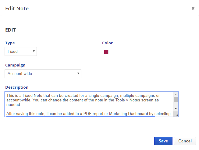 • Fixed can be used to display a message for a single campaign, specific multiple campaigns, or account-wide continuously. This note type is not limited to a specific date(s), it can be set to display in white label marketing dashboards, client dashboards, and PDF reports, and then the content can be changed as needed, in the Campaigns > Toolkit > Notes screen.