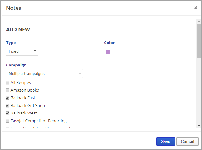 • Select a specific Campaign, Multiple Campaigns, or All Campaigns to apply the note to
