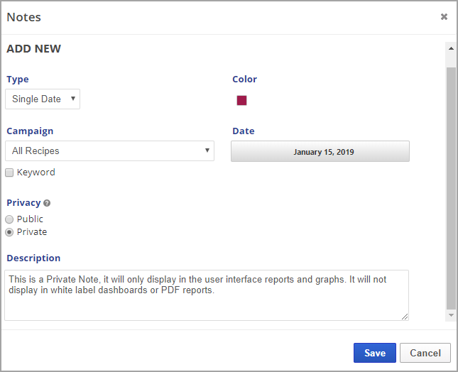 • Public is the default setting. Notes with this setting will display both inside the reporting platform and in white label dashboards and PDF reports