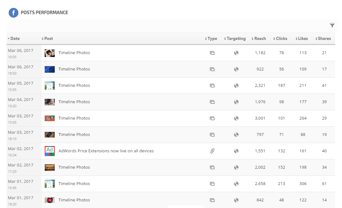 The Posts Performance table is limited to the most recent 10 Facebook posts for the time period selected. Facebook's API limits the request to a maximum of 90 days of data, if you select a longer date range, they may not provide Reach, Clicks and/or Shares data.
