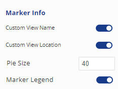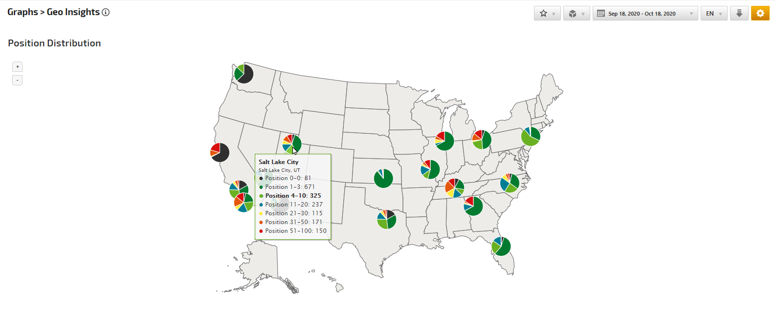 Utilizes Custom Views for multiple campaigns, US map, Position Distribution data type, Pie size 30, marker legend, default width, 600 height, and custom map and background colors.
