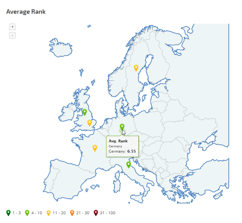Utilizes Custom Views for multiple campaigns, Europe map, Average Rank data type, Pin marker type, marker legend, default width, 600 height, and custom map and background colors.