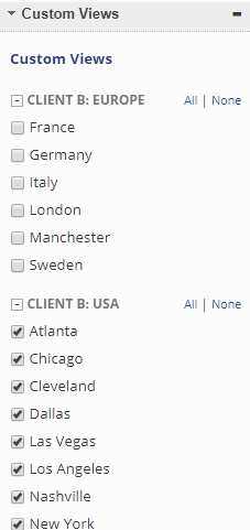 Utilizes Custom Views for multiple campaigns, US map, Visibility data type, default width and 600 height, and default map and background colors.