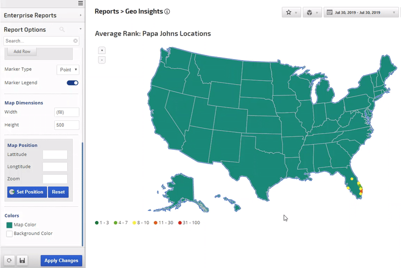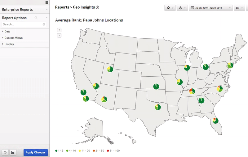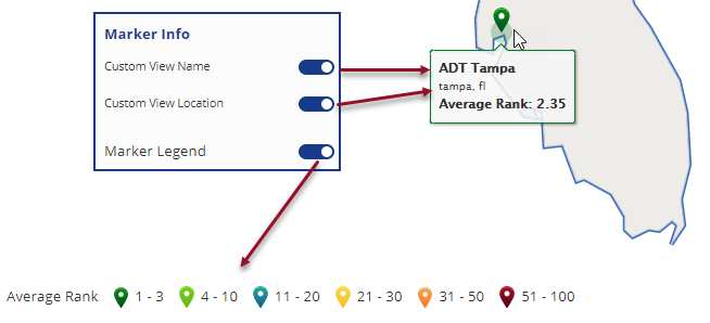 Utilizes Custom Views for multiple campaigns, US map zoomed in and locked to set position, Average Rank data type, Point marker type, marker legend, default width and 500 height, and custom map and background colors.