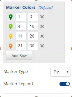 Utilizes Custom Views for multiple campaigns, World map, Average Rank data type, Pin markers, marker legend, and default width, height, and map colors.