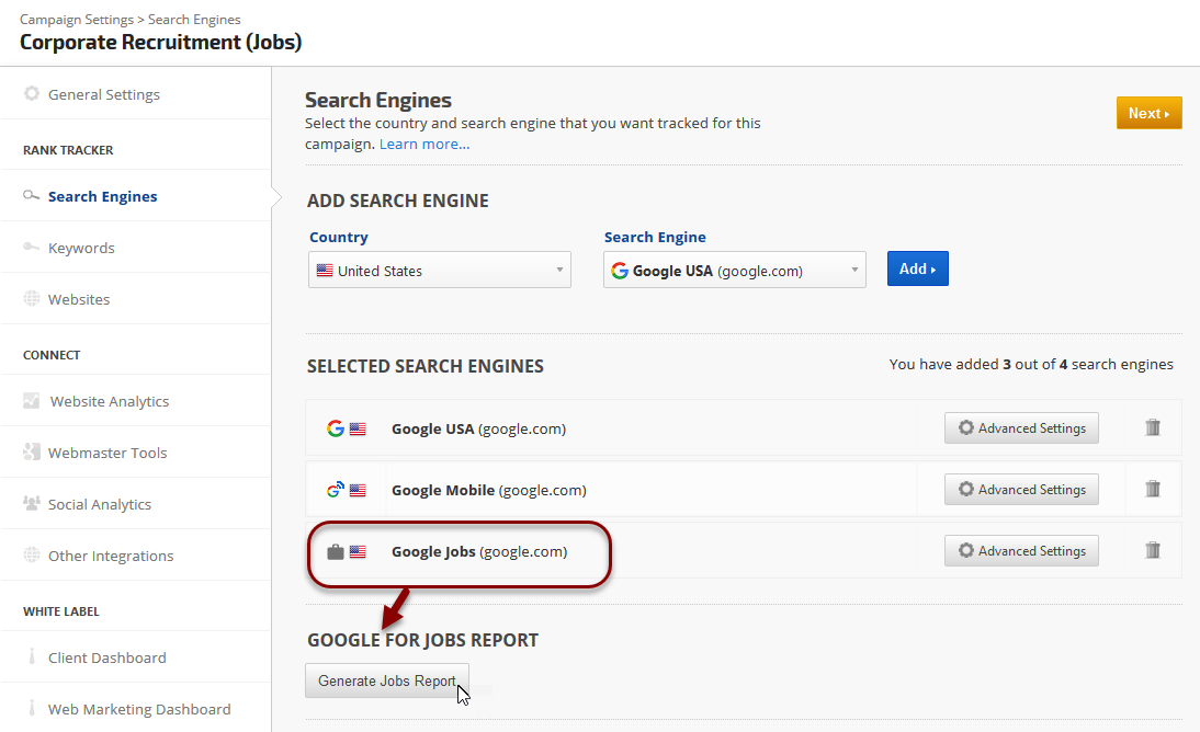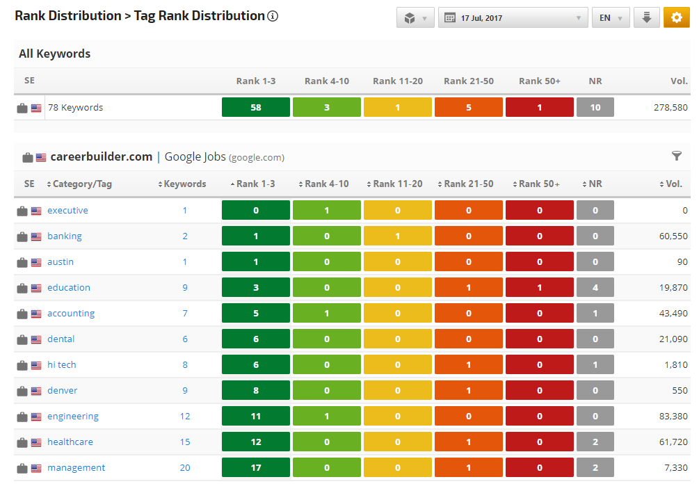 Tracking for Google Jobs results in Rank Ranger is provided via a Google Jobs search engine. Easy setup instructions are contained in this document, along with a sampling of reports that can be customized for analysis and client reporting of Google Jobs rank for the domain being tracked and its competitors. Rank is tracked for the top 100 Google Jobs search results (i.e., we provide up to 100 results, if Google serves 70 results for a keyword, then the report contains rank data for those 70 results).