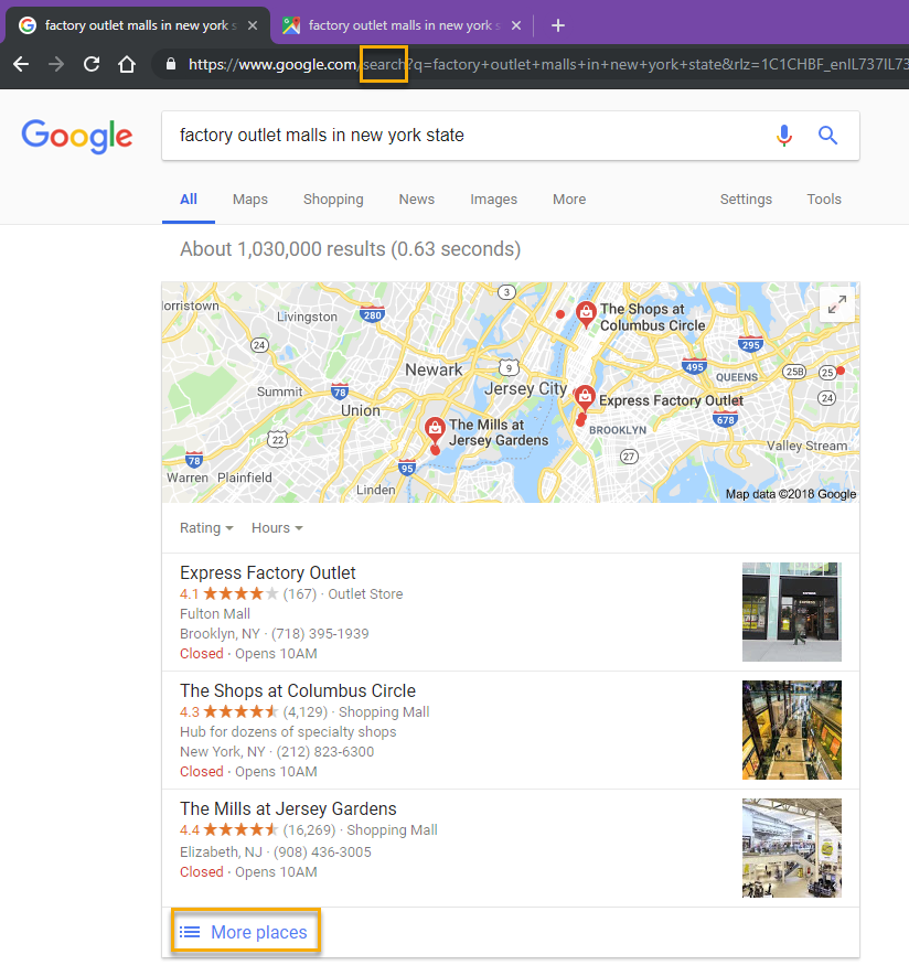 One might expect that both options would provide the same search results, however, that is not always the case as is detailed in the following example based on a search for "factory outlet malls in new york state".