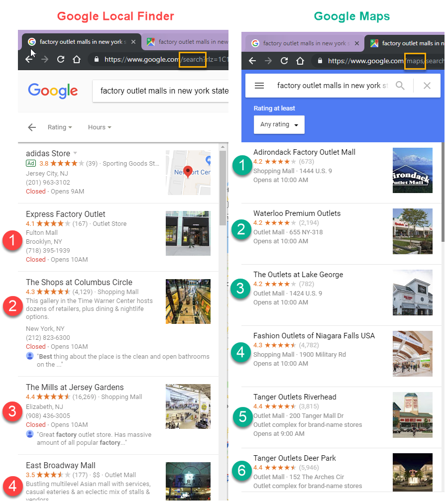 In this side by side comparison of the same keyword, we see that Google Local Finder and Maps are not providing the exact same results. For example, in Local Finder rank position 1 was Express Factory Outlet vs. Adirondack Factory Outlet Mall in Maps.