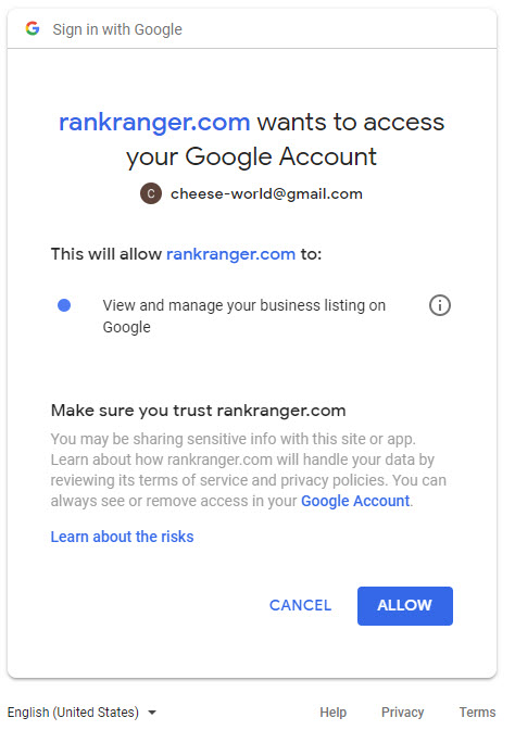 In order to provide you with performance metrics reporting, Google provides Rank Ranger's software with permission to view and manage your business listing on Google. Our software only retrieves the data that you specifically request when working on our platform. If you want to integrate your Google My Business data, click the