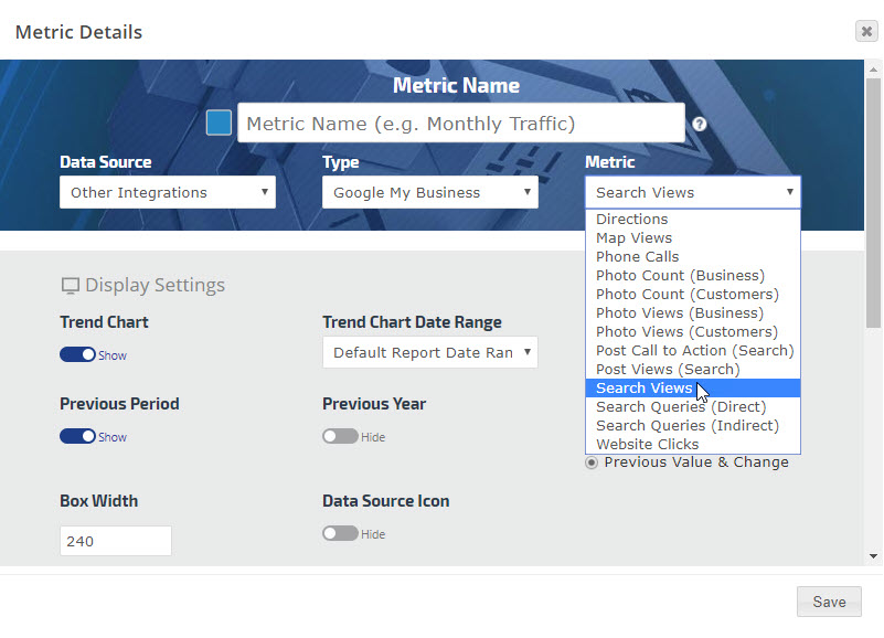 Google My Business location, the account name will display, along with a link to the Insight Graph and Metric Widgets that you can use to create performance and trending reports.